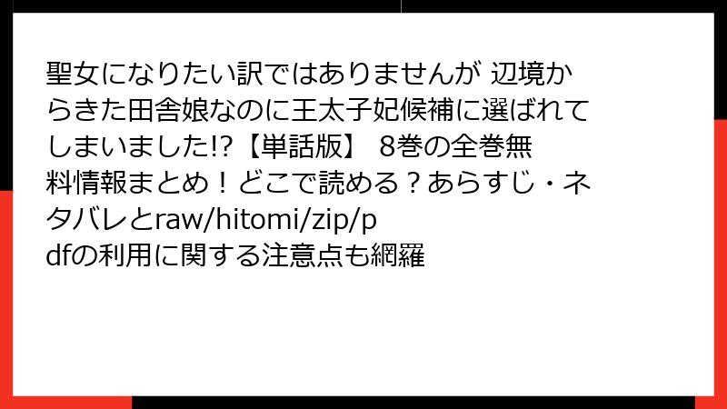 この記事では、人気コミック「聖女になりたい訳ではありませんが 辺境からきた田舎娘なのに王太子妃候補に選ばれてしまいました!?」を、海賊版サイト(例: raw、hitomi、zip、pdf、漫画バンクなど)で読むことのさまざまなリスクを詳しく解説します。これらのサイトは無料でアクセスしやすく見えますが、法的・セキュリティ面での深刻な問題を抱えています。リスクを理解し、正規の手段で楽しむことをおすすめします。以下で各側面を深掘りします。
