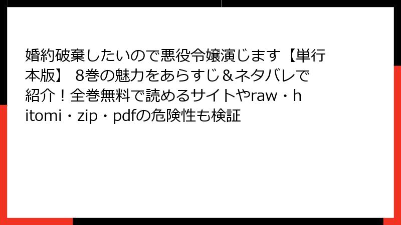 人気の悪役令嬢漫画「婚約破棄したいので悪役令嬢演じます」の8巻を、raw、hitomi、zip、pdf、漫画バンクなどの海賊版サイトで読もうと考える人もいるかもしれません。しかし、これらのサイトは違法にアップロードされたコンテンツを提供しており、利用には深刻なリスクが伴います。この記事では、法的、セキュリティ、プライバシーなどの観点から詳しく解説します。海賊版の利用は避け、正規のルートで楽しむことを強くおすすめします。
