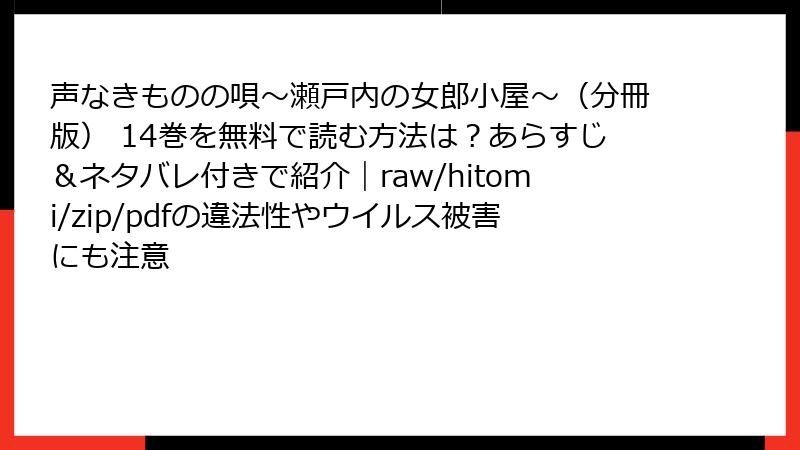 人気の漫画『声なきものの唄~瀬戸内の女郎小屋~』を無料で楽しみたいと思う人は多いですが、海賊版サイトを利用するのは大きな間違いです。raw、hitomi、zip、pdf、漫画バンクなどの違法サイトは、一見便利に見えますが、深刻なリスクを伴います。この記事では、それらのリスクを法的、セキュリティ、詐欺、倫理的観点から詳しく解説します。利用を検討している方は、ぜひ最後まで読んで、正しい選択を。