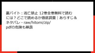 少年マンガ 裏バイト:逃亡禁止 12巻全巻無料で読むには?どこで読めるか徹底調査|あらすじ&ネタバレ・raw/hitomi/zip/pdfの危険も暴露 『裏バイト:逃亡禁止』12巻 あらすじ詳細 『裏バイト:逃亡禁止』は、田口翔太郎による人気ホラー漫画で、命を賭けた高額報酬の「裏バイト」に挑む黒嶺ユメと白浜和美の壮絶な物語が描かれています。第12巻では、「生態系」をテーマに、未知の恐怖が潜... 2025.09.02 少年マンガ裏バイト:逃亡禁止