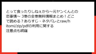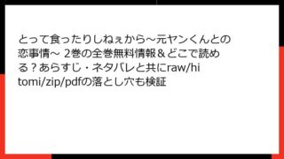 「とって食ったりしねぇから~元ヤンくんとの恋事情~」1巻のあらすじ詳解 この漫画は、強引な元ヤン男子と真面目な元委員長の再会ラブストーリーを描いた作品です。1巻では、主人公の星野美早が社内トラブルから左遷され、故郷で中学時代の同級生・香田と...
