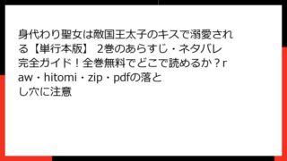 少女マンガ 身代わり聖女は敵国王太子のキスで溺愛される【単行本版】 2巻のあらすじ・ネタバレ完全ガイド!全巻無料でどこで読めるか?raw・hitomi・zip・pdfの落とし穴に注意 「身代わり聖女は敵国王太子のキスで溺愛される【単行本版】2巻」のあらすじを徹底解説 「身代わり聖女は敵国王太子のキスで溺愛される」は、織部ソマリによる原作と、うめ五郎による作画の少女マンガで、ファンタジーと恋愛が絶妙に絡み合った作品です。単... 2025.09.10 少女マンガ身代わり聖女は敵国王太子のキスで溺愛される【単行本版】