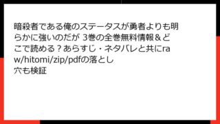 少年マンガ 暗殺者である俺のステータスが勇者よりも明らかに強いのだが 3巻の全巻無料情報&どこで読める?あらすじ・ネタバレと共にraw/hitomi/zip/pdfの落とし穴も検証 暗殺者である俺のステータスが勇者よりも明らかに強いのだが 3巻:影の暗殺者が仲間を増やし、新たな冒険へ 異世界ファンタジーの人気作『暗殺者である俺のステータスが勇者よりも明らかに強いのだが』は、主人公の織田晶がチート級の暗殺者能力で世界を駆... 2025.09.11 少年マンガ暗殺者である俺のステータスが勇者よりも明らかに強いのだが