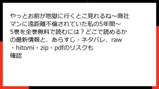 やっとお前が地獄に行くとこ見れるね~商社マンに遠距離不倫されていた私の5年間~ やっとお前が地獄に行くとこ見れるね~商社マンに遠距離不倫されていた私の5年間~ 5巻を全巻無料で読むには?どこで読めるかの最新情報と、あらすじ・ネタバレ、raw・hitomi・zip・pdfのリスクも確認
