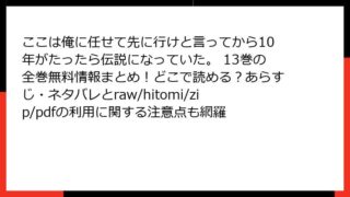 ここは俺に任せて先に行けと言ってから10年がたったら伝説になっていた。 ここは俺に任せて先に行けと言ってから10年がたったら伝説になっていた。 13巻の全巻無料情報まとめ!どこで読める?あらすじ・ネタバレとraw/hitomi/zip/pdfの利用に関する注意点も網羅