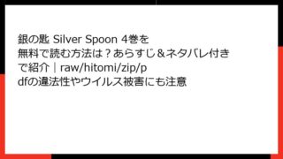 少年マンガ 銀の匙 Silver Spoon 4巻を無料で読む方法は?あらすじ&ネタバレ付きで紹介|raw/hitomi/zip/pdfの違法性やウイルス被害にも注意 銀の匙 Silver Spoon 4巻の魅力的なあらすじ探訪 荒川弘先生の傑作漫画『銀の匙 Silver Spoon』は、北海道の農業高校を舞台にした青春グラフィティとして、多くの読者を魅了してきました。4巻では、主人公・八軒勇吾が農業の厳... 2025.09.15 少年マンガ銀の匙 Silver Spoon