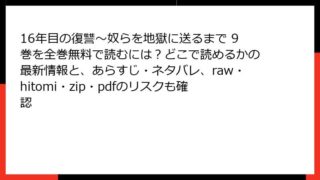 16年目の復讐~奴らを地獄に送るまで 16年目の復讐~奴らを地獄に送るまで 9巻を全巻無料で読むには?どこで読めるかの最新情報と、あらすじ・ネタバレ、raw・hitomi・zip・pdfのリスクも確認 16年目の復讐~奴らを地獄に送るまで 9巻:壮絶な復讐のクライマックスへ こんにちは、漫画好きのブロガーです! 今日は、桜宇宙さんによる人気復讐漫画『16年目の復讐~奴らを地獄に送るまで』の9巻について詳しく語っていきたいと思います。この作... 2025.09.15 16年目の復讐~奴らを地獄に送るまで青年マンガ