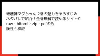 少年マンガ 破壊神マグちゃん 2巻の魅力をあらすじ&ネタバレで紹介!全巻無料で読めるサイトやraw・hitomi・zip・pdfの危険性も検証 破壊神マグちゃん 2巻:ゆるっとした破壊神の日常がさらに賑やかになる一冊 こんにちは、漫画好きのブロガーです! 今日は、週刊少年ジャンプで連載された上木敬先生の人気作『破壊神マグちゃん』の第2巻について、詳しくあらすじを掘り下げてお届けしま... 2025.09.22 少年マンガ破壊神マグちゃん