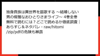 少年マンガ 独身貴族は異世界を謳歌する ~結婚しない男の優雅なおひとりさまライフ~ 4巻全巻無料で読むには?どこで読めるか徹底調査|あらすじ&ネタバレ・raw/hitomi/zip/pdfの危険も暴露 異世界で優雅に独身ライフ!『独身貴族は異世界を謳歌する ~結婚しない男の優雅なおひとりさまライフ~』4巻の魅力的なあらすじを徹底解説 こんにちは、異世界ファンタジー好きの皆さん! 今日のブログ記事では、人気漫画『独身貴族は異世界を謳歌する ... 2025.09.22 少年マンガ独身貴族は異世界を謳歌する ~結婚しない男の優雅なおひとりさまライフ~