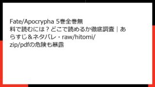 Fate/Apocrypha Fate/Apocrypha 5巻全巻無料で読むには?どこで読めるか徹底調査|あらすじ&ネタバレ・raw/hitomi/zip/pdfの危険も暴露 Fate/Apocrypha 5巻:激化する聖杯大戦の渦中 『Fate/Apocrypha』は、TYPE-MOONの人気シリーズ『Fate/stay night』の外伝として描かれる壮大な聖杯戦争の物語。原作小説を基に、石田あきら氏による漫... 2025.09.24 Fate/Apocrypha少年マンガ