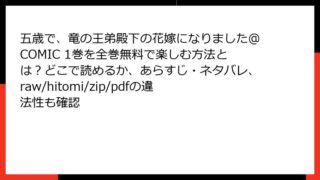 五歳で、竜の王弟殿下の花嫁になりました@COMIC 五歳で、竜の王弟殿下の花嫁になりました@COMIC 1巻を全巻無料で楽しむ方法とは?どこで読めるか、あらすじ・ネタバレ、raw/hitomi/zip/pdfの違法性も確認 「五歳で、竜の王弟殿下の花嫁になりました@COMIC 第1巻」あらすじ詳細 「五歳で、竜の王弟殿下の花嫁になりました@COMIC」は、須王あやによる原作小説を椎名秋乃がコミカライズした、年の差リリカルファンタジー漫画です。異世界転生をテーマ... 2025.09.27 五歳で、竜の王弟殿下の花嫁になりました@COMIC少女マンガ