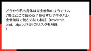 どうやら私の身体は完全無敵のようですね どうやら私の身体は完全無敵のようですね 7巻はどこで読める?あらすじやネタバレ、全巻無料で読む方法も検証(rawやhitomi、zip/pdf利用のリスクも解説) 『どうやら私の身体は完全無敵のようですね』7巻の魅力に迫る! 完全無敵ヒロインのドタバタ異世界生活 こんにちは、異世界ファンの皆さん! 今日のブログは、ちゃつふささん原作、さばねこさん作画の人気コミカライズ作品『どうやら私の身体は完全無敵の... 2025.09.28 どうやら私の身体は完全無敵のようですね少年マンガ