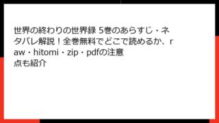 世界の終わりの世界録 世界の終わりの世界録 5巻のあらすじ・ネタバレ解説!全巻無料でどこで読めるか、raw・hitomi・zip・pdfの注意点も紹介 『世界の終わりの世界録』5巻の魅力に迫る! 伝説の再来が織りなす壮大な冒険 皆さん、こんにちは! ファンタジー漫画好きのブログ管理人です。今日は、雨水龍先生の作画による人気コミカライズ作品『世界の終わりの世界録』5巻のあらすじを、たっぷり詳... 2025.09.28 世界の終わりの世界録少年マンガ