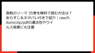 少年マンガ 食戟のソーマ 35巻を無料で読む方法は?あらすじ&ネタバレ付きで紹介|raw/hitomi/zip/pdfの違法性やウイルス被害にも注意 食戟のソーマ 35巻:激闘の「THE BLUE」トーナメントが加速する! みなさん、こんにちは! 料理バトル漫画の金字塔、『食戟のソーマ』の35巻が登場しました。この巻では、世界最高峰の料理大会「THE BLUE」のトーナメント戦が本格的に... 2025.10.05 少年マンガ食戟のソーマ