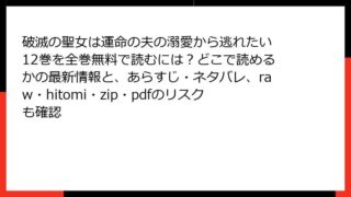 女性マンガ 破滅の聖女は運命の夫の溺愛から逃れたい 12巻を全巻無料で読むには?どこで読めるかの最新情報と、あらすじ・ネタバレ、raw・hitomi・zip・pdfのリスクも確認 破滅の聖女は運命の夫の溺愛から逃れたい 12巻:運命の渦中での新たな試練と愛の深化 こんにちは、異世界ファンタジー好きの皆さん! 今日のブログ記事では、人気急上昇中の漫画『破滅の聖女は運命の夫の溺愛から逃れたい』第12巻の詳細なあらすじをお... 2025.11.08 女性マンガ破滅の聖女は運命の夫の溺愛から逃れたい