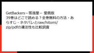 GetBackers-奪還屋- 愛蔵版 GetBackers-奪還屋- 愛蔵版 39巻はどこで読める?全巻無料の方法・あらすじ・ネタバレとraw/hitomi/zip/pdfの違法性も比較調査 GetBackers-奪還屋- 愛蔵版 39巻 詳細あらすじ:シリーズ大団円の壮絶なクライマックス 『GetBackers-奪還屋-』の愛蔵版39巻は、原作・青樹佑夜、作画・綾峰欄人による長編バトルアクションの最終巻。週刊少年マガジンで約8... 2025.11.09 GetBackers-奪還屋- 愛蔵版少年マンガ