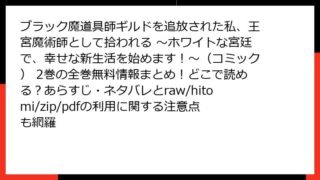 ブラック魔道具師ギルドを追放された私、王宮魔術師として拾われる ~ホワイトな宮廷で、幸せな新生活を始めます!~(コミック) ブラック魔道具師ギルドを追放された私、王宮魔術師として拾われる ~ホワイトな宮廷で、幸せな新生活を始めます!~(コミック) 2巻の全巻無料情報まとめ!どこで読める?あらすじ・ネタバレとraw/hitomi/zip/pdfの利用に関する注意点も網羅