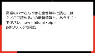 青年マンガ 高嶺のハナさん 9巻を全巻無料で読むには?どこで読めるかの最新情報と、あらすじ・ネタバレ、raw・hitomi・zip・pdfのリスクも確認 高嶺のハナさん 9巻:遠距離恋愛編の胸キュン展開を徹底解説! みなさん、こんにちは! ラブコメ好きのブロガー、コミックマニアです。今日は、ムラタコウジ先生の大人気作『高嶺のハナさん』9巻のあらすじを、ネタバレ満載で詳しくお届けします。この作... 2025.11.15 青年マンガ高嶺のハナさん