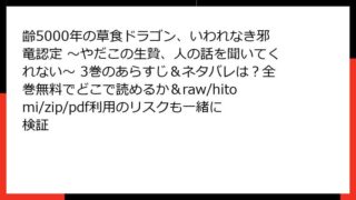 少年マンガ 齢5000年の草食ドラゴン、いわれなき邪竜認定 ~やだこの生贄、人の話を聞いてくれない~ 3巻のあらすじ&ネタバレは?全巻無料でどこで読めるか&raw/hitomi/zip/pdf利用のリスクも一緒に検証 齢5000年の草食ドラゴン、いわれなき邪竜認定 ~やだこの生贄、人の話を聞いてくれない~ 3巻 徹底レビュー! 勘違いコメディの新展開に大爆笑 こんにちは、ファンタジー漫画好きのブロガーです! 今日は、榎本快晴さん原作、ムロコウイチさん作画... 2025.11.18 少年マンガ齢5000年の草食ドラゴン、いわれなき邪竜認定 ~やだこの生贄、人の話を聞いてくれない~