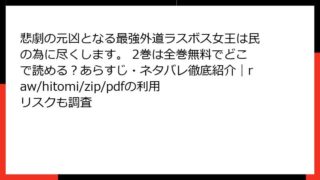 少女マンガ 悲劇の元凶となる最強外道ラスボス女王は民の為に尽くします。 2巻は全巻無料でどこで読める?あらすじ・ネタバレ徹底紹介|raw/hitomi/zip/pdfの利用リスクも調査 悲劇の元凶となる最強外道ラスボス女王は民の為に尽くします。 2巻 詳細あらすじ 人気乙女ゲームの世界に転生した主人公が、極悪ラスボス女王として描かれるはずの運命を逆手に取り、民を救うために奔走する本作。2巻では、ヴァル編が中心となり、主人公... 2025.11.23 少女マンガ悲劇の元凶となる最強外道ラスボス女王は民の為に尽くします。