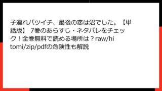 女性マンガ 子連れバツイチ、最後の恋は沼でした。【単話版】 7巻のあらすじ・ネタバレをチェック!全巻無料で読める場所は?raw/hitomi/zip/pdfの危険性も解説 子連れバツイチ、最後の恋は沼でした。【単話版】 7巻 詳細あらすじレビュー こんにちは、漫画好きのブロガーです! 今日は、餅本もよ先生の人気作『子連れバツイチ、最後の恋は沼でした。【単話版】 7巻』について、詳しく深掘りしていきたいと思いま... 2025.11.29 女性マンガ子連れバツイチ、最後の恋は沼でした。【単話版】