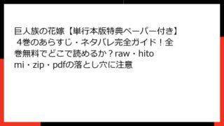 BLマンガ 巨人族の花嫁【単行本版特典ペーパー付き】 4巻のあらすじ・ネタバレ完全ガイド!全巻無料でどこで読めるか?raw・hitomi・zip・pdfの落とし穴に注意 巨人族の花嫁 4巻:異世界の甘美なる体格差ラブストーリー、深まる絆と情熱の渦中 みなさん、こんにちは! BL漫画好きのブログ主です。今日は、ITKZ先生の人気作『巨人族の花嫁』第4巻のあらすじを、たっぷり詳しくお届けします。この作品は、異世... 2025.11.30 BLマンガ巨人族の花嫁【単行本版特典ペーパー付き】