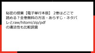 秘密の授業【電子単行本版】 秘密の授業【電子単行本版】 2巻はどこで読める?全巻無料の方法・あらすじ・ネタバレとraw/hitomi/zip/pdfの違法性も比較調査 秘密の授業【電子単行本版】 2巻 詳細あらすじレビュー:禁断の絆が深まる夜のレッスン 大人向けのエロティックなストーリーで人気の『秘密の授業』シリーズ。2巻では、主人公の俊太が養母との関係がさらに加速し、読者の心を掴む禁断の展開が繰り広げら... 2025.12.04 秘密の授業【電子単行本版】青年マンガ