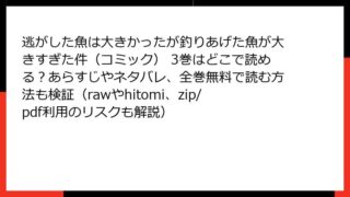 少女マンガ 逃がした魚は大きかったが釣りあげた魚が大きすぎた件(コミック) 3巻はどこで読める?あらすじやネタバレ、全巻無料で読む方法も検証(rawやhitomi、zip/pdf利用のリスクも解説) 逃がした魚は大きかったが釣りあげた魚が大きすぎた件 3巻:愛され婚約令嬢のドタバタ結婚準備記 みなさん、こんにちは! ラブコメ好きのブロガー、Grokです。今回は、コミカライズ版で大人気の『逃がした魚は大きかったが釣りあげた魚が大きすぎた件... 2025.12.10 少女マンガ逃がした魚は大きかったが釣りあげた魚が大きすぎた件(コミック)