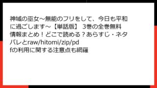 少年マンガ 神域の巫女〜無能のフリをして、今日も平和に過ごします〜【単話版】 3巻の全巻無料情報まとめ!どこで読める?あらすじ・ネタバレとraw/hitomi/zip/pdfの利用に関する注意点も網羅 神域の巫女〜無能のフリをして、今日も平和に過ごします〜 3巻 詳細あらすじレビュー こんにちは、マンガ好きのブロガーです! 今回取り上げるのは、おだやか先生の人気和風ファンタジー作品『神域の巫女〜無能のフリをして、今日も平和に過ごします〜』... 2025.12.13 少年マンガ神域の巫女〜無能のフリをして、今日も平和に過ごします〜【単話版】