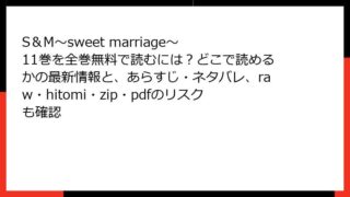 S&M~sweet marriage~ S&M~sweet marriage~ 11巻を全巻無料で読むには?どこで読めるかの最新情報と、あらすじ・ネタバレ、raw・hitomi・zip・pdfのリスクも確認 S&M~sweet marriage~ 11巻 詳細あらすじレビュー:父の謎に迫る中、甘く熱い夫婦の絆 こんにちは、マンガ好きのブロガーです! 今回取り上げるのは、悠妃りゅう先生の人気ラブストーリー『S&M~sweet marriage~』... 2025.12.13 S&M~sweet marriage~女性マンガ