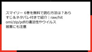 スマイリー スマイリー 6巻を無料で読む方法は?あらすじ&ネタバレ付きで紹介|raw/hitomi/zip/pdfの違法性やウイルス被害にも注意 スマイリー 6巻 詳細あらすじ:教団の闇がさらに深まる衝撃の展開 これまでの物語を振り返る 服部未定による新興宗教サスペンス『スマイリー』は、笑顔の裏に潜む狂気と人間の弱さを鋭く描いた作品です。主人公の鴨目友司は、愛娘を不慮の事故で失い、妻... 2025.12.17 スマイリー青年マンガ