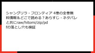 シャングリラ・フロンティア シャングリラ・フロンティア 4巻の全巻無料情報&どこで読める?あらすじ・ネタバレと共にraw/hitomi/zip/pdfの落とし穴も検証 シャングリラ・フロンティア 第4巻 詳細あらすじと魅力 人気VRMMOを舞台にした冒険譚『シャングリラ・フロンティア』第4巻は、物語の大きな転換点となるボス戦が中心。クソゲーハンターのサンラクが、仲間たちと共に未踏の強敵に挑む姿が熱く描かれ... 2025.12.18 シャングリラ・フロンティア少年マンガ