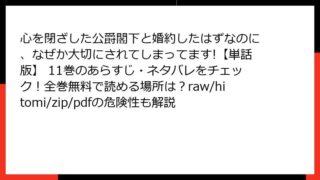 女性マンガ 心を閉ざした公爵閣下と婚約したはずなのに、なぜか大切にされてしまってます!【単話版】 11巻のあらすじ・ネタバレをチェック!全巻無料で読める場所は?raw/hitomi/zip/pdfの危険性も解説 心を閉ざした公爵閣下と婚約したはずなのに、なぜか大切にされてしまってます!【単話版】11巻 詳細あらすじ 作品の基本概要 この作品は、魔法と貴族社会を舞台にしたロマンティックファンタジーです。主人公のアリーチェ・マリーノは、精霊の加護がなく... 2025.12.19 女性マンガ心を閉ざした公爵閣下と婚約したはずなのに、なぜか大切にされてしまってます!【単話版】