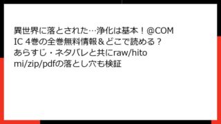 異世界に落とされた…浄化は基本!@COMIC 異世界に落とされた…浄化は基本!@COMIC 4巻の全巻無料情報&どこで読める?あらすじ・ネタバレと共にraw/hitomi/zip/pdfの落とし穴も検証 異世界に落とされた…浄化は基本!@COMIC 4巻のあらすじ詳解 この記事では、人気コミック「異世界に落とされた…浄化は基本!@COMIC」の第4巻のあらすじを詳しく解説します。異世界転移の主人公が浄化魔法を駆使してサバイバルする物語の続き... 2025.12.19 異世界に落とされた…浄化は基本!@COMIC青年マンガ