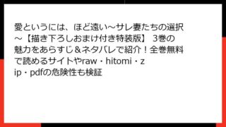 女性マンガ 愛というには、ほど遠い~サレ妻たちの選択~【描き下ろしおまけ付き特装版】 3巻の魅力をあらすじ&ネタバレで紹介!全巻無料で読めるサイトやraw・hitomi・zip・pdfの危険性も検証 愛というには、ほど遠い~サレ妻たちの選択~【描き下ろしおまけ付き特装版】 3巻のあらすじ詳解 この人気漫画シリーズの第3巻では、浮気された妻たちの心の葛藤がさらに深掘りされ、主人公の蒼葉が新たな選択肢に直面します。サレ妻のリアルな心理描写が... 2025.12.20 女性マンガ愛というには、ほど遠い~サレ妻たちの選択~【描き下ろしおまけ付き特装版】