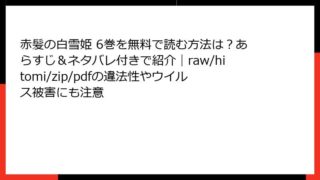 少女マンガ 赤髪の白雪姫 6巻を無料で読む方法は?あらすじ&ネタバレ付きで紹介|raw/hitomi/zip/pdfの違法性やウイルス被害にも注意 赤髪の白雪姫 6巻 あらすじ詳解 あきづき空太による人気ファンタジー少女漫画『赤髪の白雪姫』の6巻は、白雪の冒険がさらに深みを増す展開を迎えます。この巻では、白雪がタンバルン王国に滞在する中で新たな脅威に直面し、ゼンやオビ、ラジ王子などのキ... 2025.12.21 少女マンガ赤髪の白雪姫