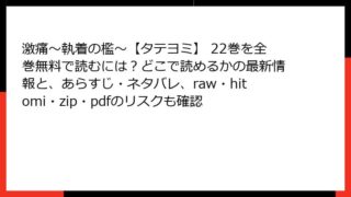 BLマンガ 激痛~執着の檻~【タテヨミ】 22巻を全巻無料で読むには?どこで読めるかの最新情報と、あらすじ・ネタバレ、raw・hitomi・zip・pdfのリスクも確認 激痛~執着の檻~ 22巻 詳細あらすじ この記事では、縦読み漫画「激痛~執着の檻~」の22巻について、ネタバレを含む詳細なあらすじを紹介します。BL要素が強い作品で、執着と痛みのテーマが絡み合うストーリーです。全体の流れを振り返りながら、2... 2025.12.22 BLマンガ激痛~執着の檻~【タテヨミ】