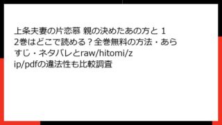 上条夫妻の片恋慕 親の決めたあの方と 上条夫妻の片恋慕 親の決めたあの方と 12巻はどこで読める?全巻無料の方法・あらすじ・ネタバレとraw/hitomi/zip/pdfの違法性も比較調査 上条夫妻の片恋慕 親の決めたあの方と 12巻 あらすじ詳解 この記事では、桜井飛鳥原作、伽月るーこ作画の人気漫画「上条夫妻の片恋慕 親の決めたあの方と」の12巻に焦点を当てて、詳細なあらすじを紹介します。政略結婚から始まる切ない恋物語が、ま... 2025.12.24 上条夫妻の片恋慕 親の決めたあの方と女性マンガ