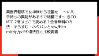 異世界転移で女神様から祝福を! ~いえ、手持ちの異能があるので結構です~ @COMIC 異世界転移で女神様から祝福を! ~いえ、手持ちの異能があるので結構です~ @COMIC 2巻はどこで読める?全巻無料の方法・あらすじ・ネタバレとraw/hitomi/zip/pdfの違法性も比較調査