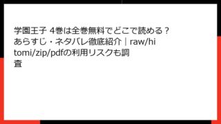 学園王子 学園王子 4巻は全巻無料でどこで読める?あらすじ・ネタバレ徹底紹介|raw/hitomi/zip/pdfの利用リスクも調査 この漫画・コミックの、ネタバレ情報を詳しく。単一のの見出しタグから始めて、ブログ記事形式で出力して。複数のタグを使用して、読み応えがあるように。HTMLで出力。やなどの箇条書きのHTMLタグや、tableタグも使用してOK。ただし、リンクや... 2025.12.28 学園王子少女マンガ