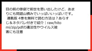 女性マンガ 目の前の惨劇で前世を思い出したけど、あまりにも問題山積みでいっぱいいっぱいです。 連載版 4巻を無料で読む方法は?あらすじ&ネタバレ付きで紹介|raw/hitomi/zip/pdfの違法性やウイルス被害にも注意 目の前の惨劇で前世を思い出したけど、あまりにも問題山積みでいっぱいいっぱいです。連載版 4巻 あらすじ この作品は、異世界転生要素を交えた医療ファンタジー小説で、主人公のネオンが前世の看護師知識を活かして辺境の医療改革に挑む物語です。連載版... 2025.12.28 女性マンガ目の前の惨劇で前世を思い出したけど、あまりにも問題山積みでいっぱいいっぱいです。 連載版
