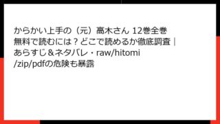 からかい上手の(元)高木さん からかい上手の(元)高木さん 12巻全巻無料で読むには?どこで読めるか徹底調査|あらすじ&ネタバレ・raw/hitomi/zip/pdfの危険も暴露 カラダ探し 2巻 あらすじ ホラー要素満載の人気漫画『カラダ探し』の第2巻は、恐怖の連鎖がさらに加速します。主人公の明日香たちが強制的に参加させられる「カラダ探し」のゲームが、夜の学校を舞台に繰り広げられます。この巻では、謎の少女・遥のバラ... 2025.12.30 からかい上手の(元)高木さん少年マンガ