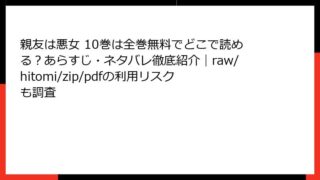 女性マンガ 親友は悪女 10巻は全巻無料でどこで読める?あらすじ・ネタバレ徹底紹介|raw/hitomi/zip/pdfの利用リスクも調査 親友は悪女 10巻 あらすじ詳解 人気漫画「親友は悪女」の10巻は、物語の核心に迫る展開が満載です。高校時代からの親友である高遠妃乃の悪女っぷりがさらに露呈し、主人公の堀江真奈や周囲のキャラクターたちが大きな試練を迎えます。ここでは、巻全体... 2026.01.07 女性マンガ親友は悪女